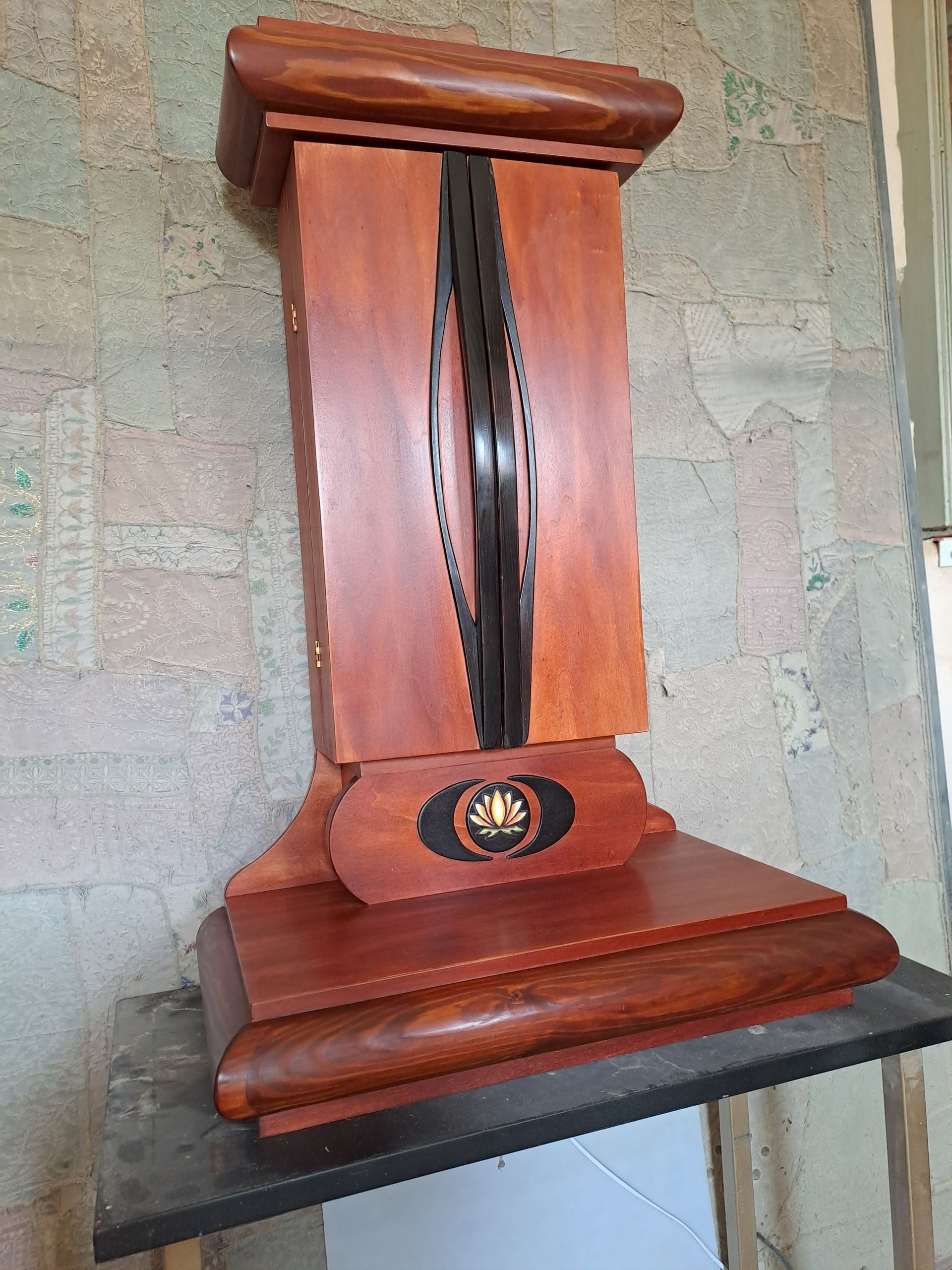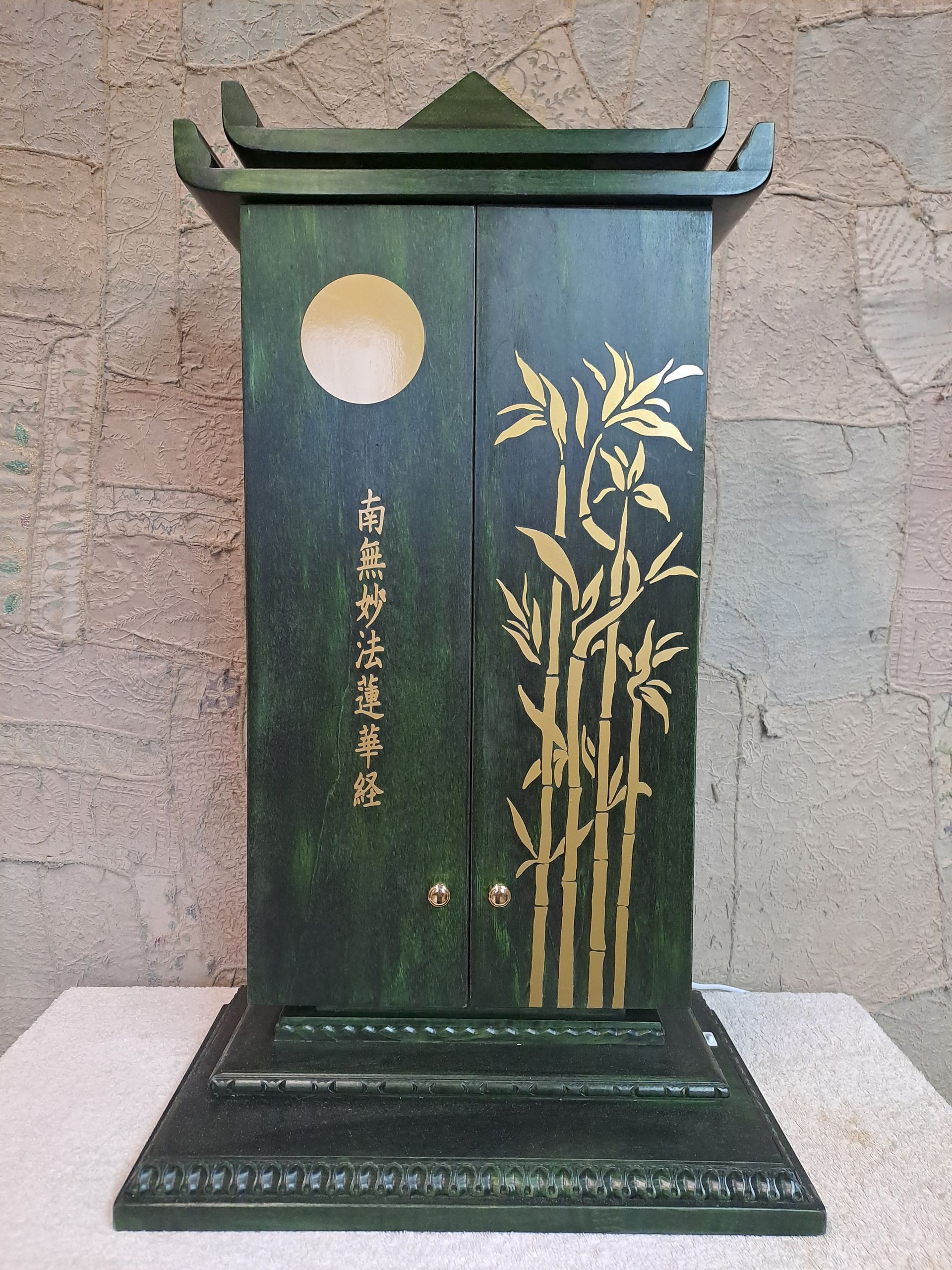 La scritta giapponese e’ NAM MYOHO RENGE KYO, ovvero il mezzo con cui le persone possono nutrire speranza e determinazione per rinascere dalla distruzione. Il simbolo della rinascita e’ rappresentato dal sole posto frontalmente in alto. Le misure esterne: largh. 35 x h. 90 x prof. 15 cm.