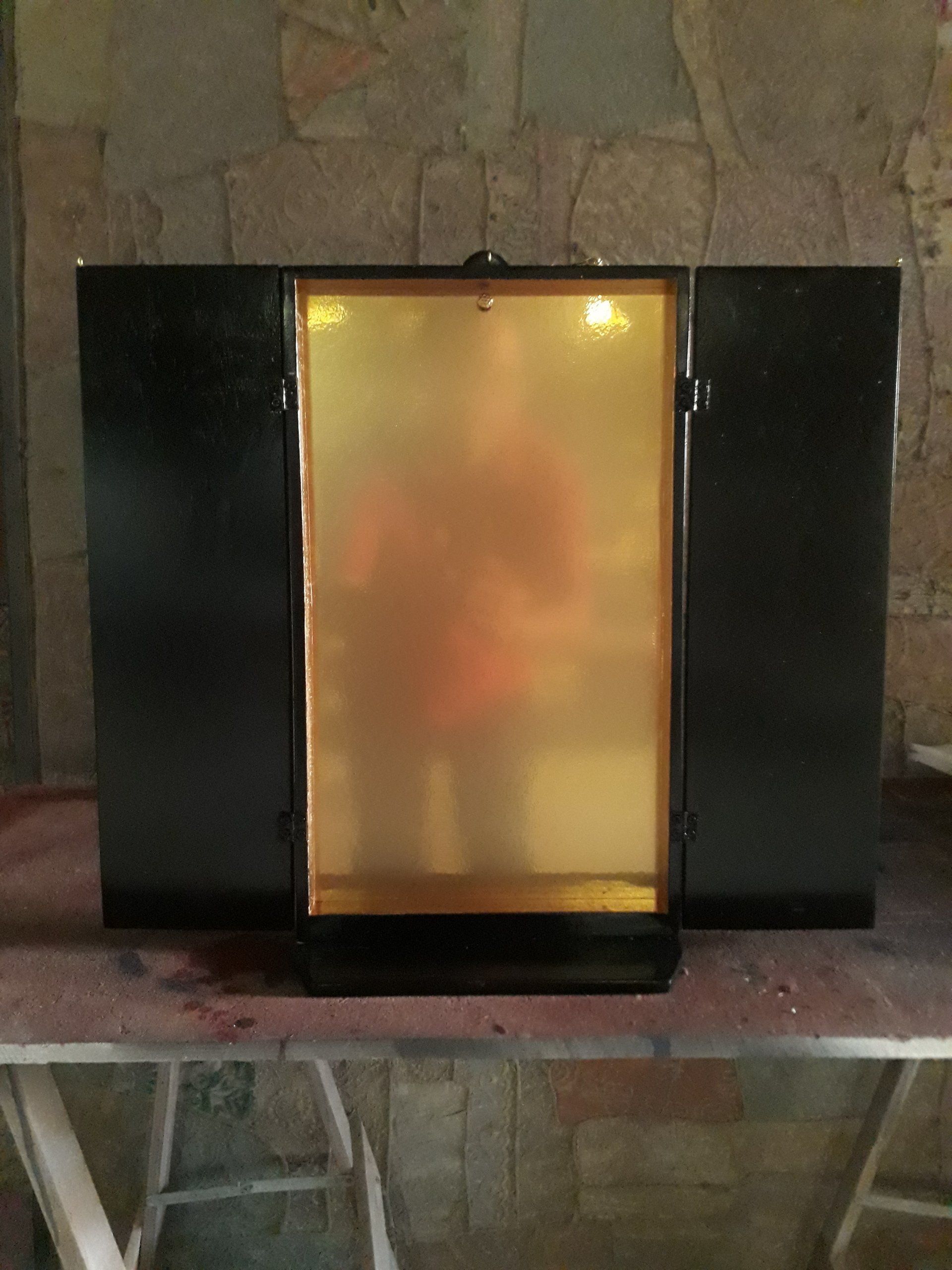 Butsudan di piccole dimensioni (cm. 46 x 27 x spessore 4) con lucchetto di chiusura.