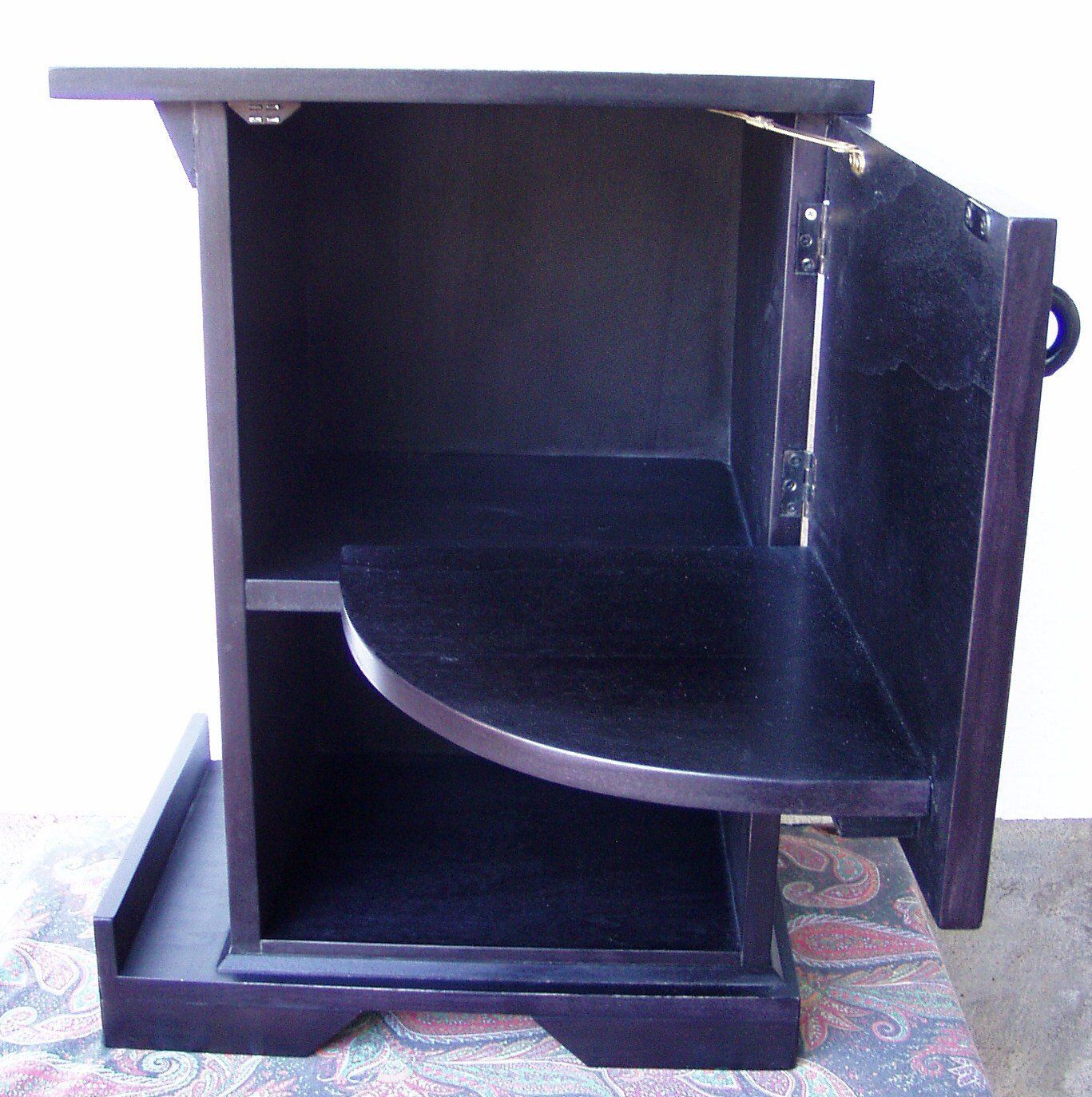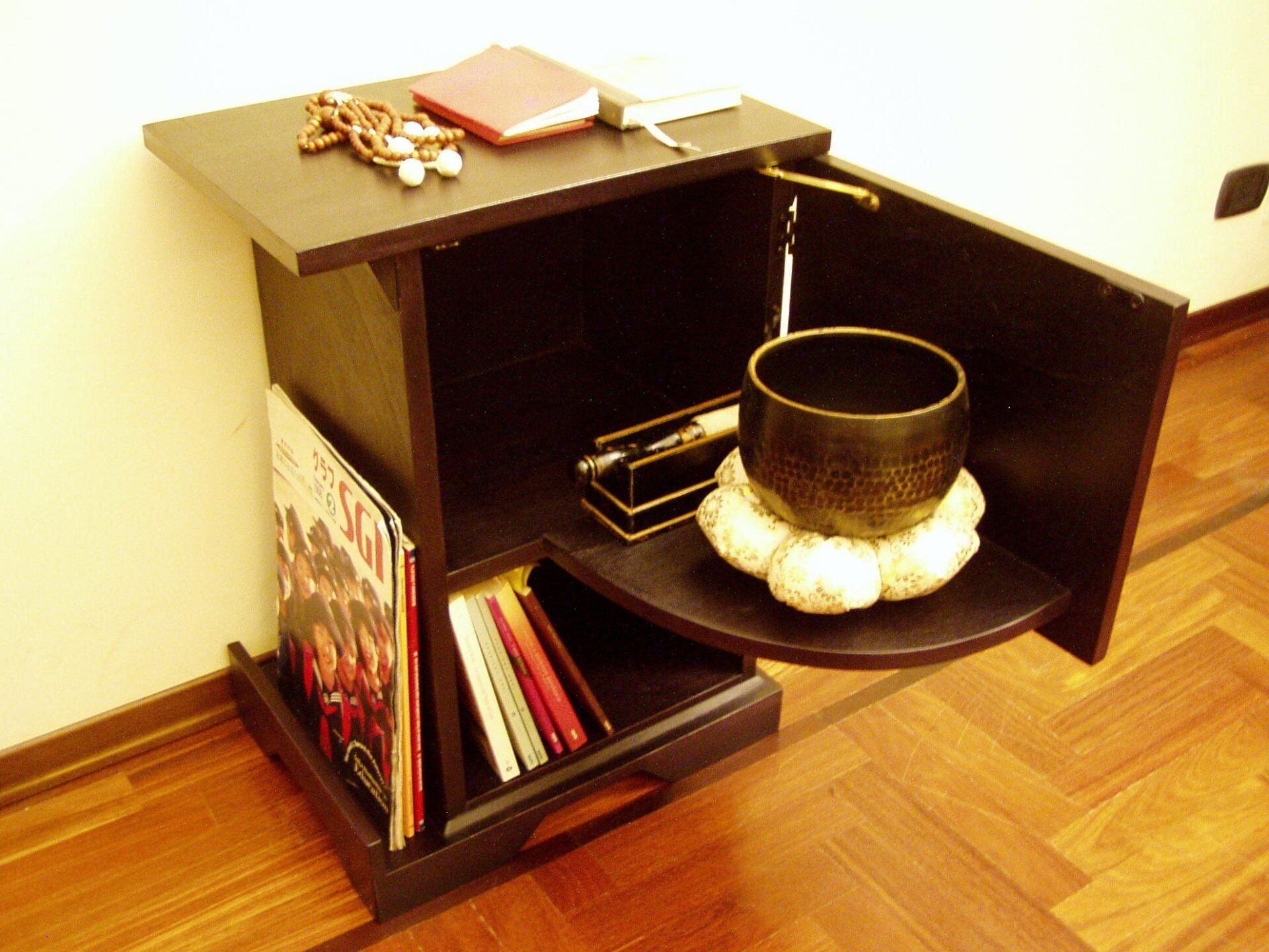 Tavolino con vano porta campana richiudibile, vano a giorno e portariviste. Dimensioni: h. 62,5 x l. 45 x Pr.32 cm.